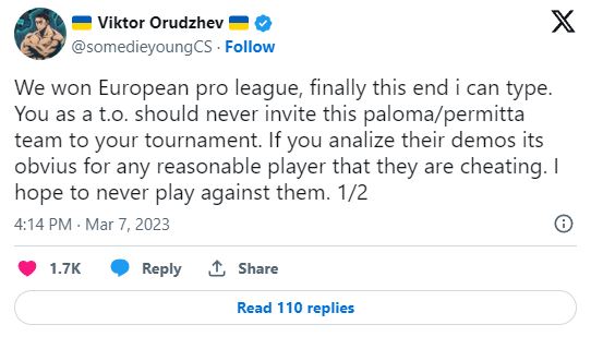 此前,蒙特队队长 Viktor “sdy” Orudjev 指责这些队员作弊,尽管他们当时的标签是 Permitta。
