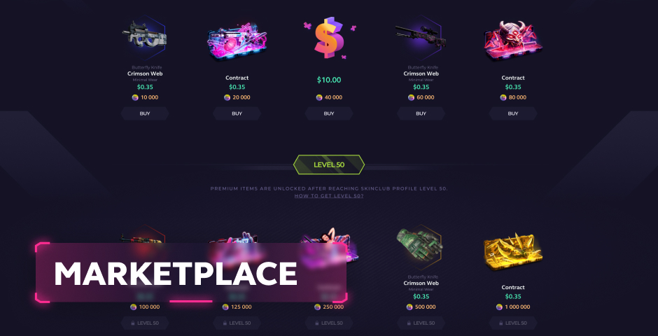 此外,对于拥有 Skin.Club 50级及以上等级的用户,市场中还有额外的产品可供选择。 这些项目也将每周更新。