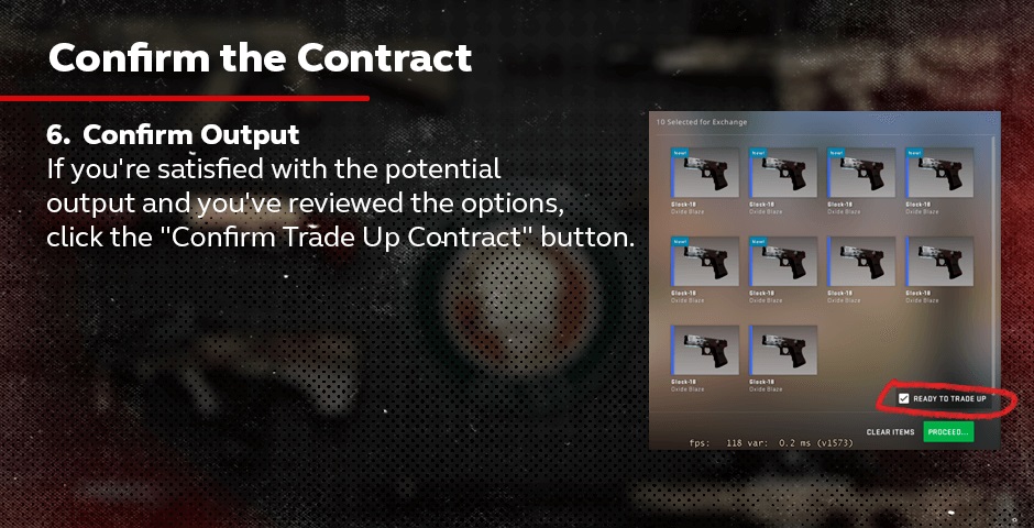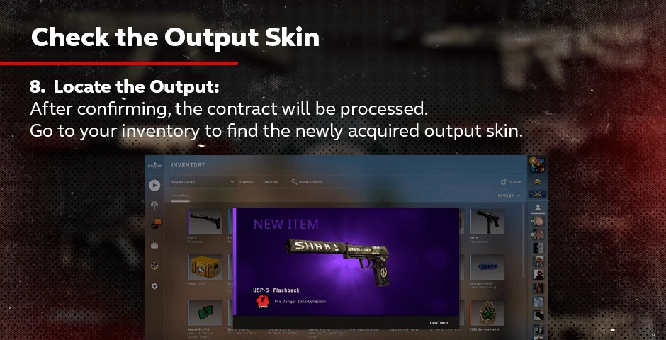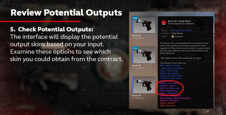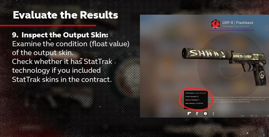 检查输出皮肤:检查输出皮肤的状况(磨损值)。如果你在合同中包括了StatTrak™皮肤,请检查它是否具有StatTrak™技术。